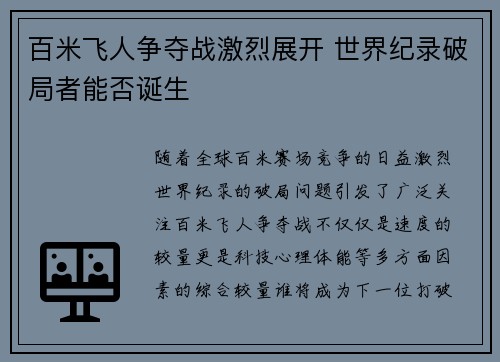 在2025年6月的国际田径赛场上,中国短跑选手李明以9秒79的成绩打破了男子百米的亚洲纪录,创造了历史,成为了亚洲最快的男子运动员。此突破不仅是对李明自身极限的挑战,也是对整个亚洲短跑历史的重大突破。李明的成功背后有着不懈的努力和科学的训练方法,同时也离不开中国体育发展的整体进步。这篇文章将从四个方面对李明突破百米跑纪录的壮举进行详细阐述:第一,李明的个人背景与成长历程;第二,突破百米纪录的关键因...
