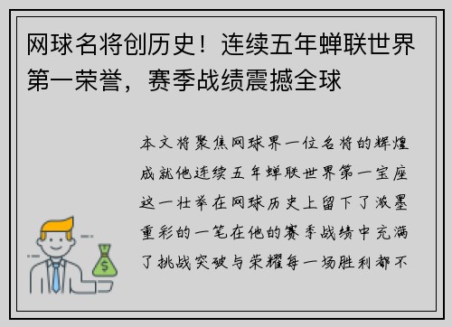 文章摘要: 诺瓦克·德约科维奇,这位世界网坛的传奇人物,正迎接全新的挑战,备战年度最后的大满贯赛事——美国网球公开赛。作为网球史上最为辉煌的球员之一,德约科维奇不仅在本赛季已经取得显著的成绩,他还将争夺更多历史性记录,向自己的职业生涯注入新的动力。文章将从德约科维奇的身体状态、心态调整、赛季规划以及他与竞争对手的较量四个方面,详细探讨他如何应对这些挑战,力争在即将到来的大满贯赛中创造历史新高,并进...